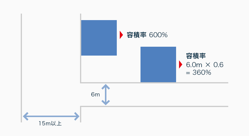 大通り沿いの物件は、容積率600%となりますが、一本中に入るだけで、容積率が360%になってしまうことになります。