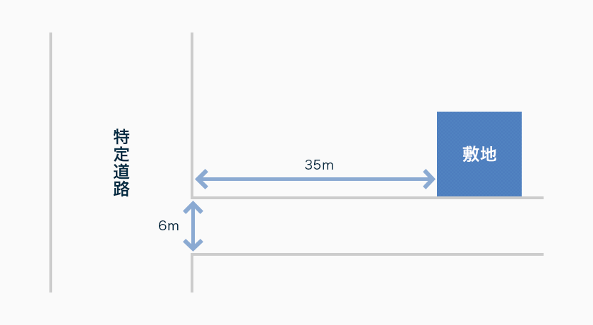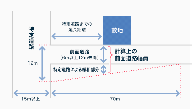 前面道路幅員が6m以上12m未満であり、敷地が70m以内で特定道路に接続している場合、容積率が緩和されるという規定です。