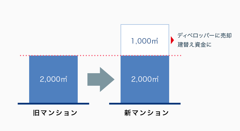 それは、建替え後の新築マンションの床面積の一部をディベロッパーに売却することで可能となります。