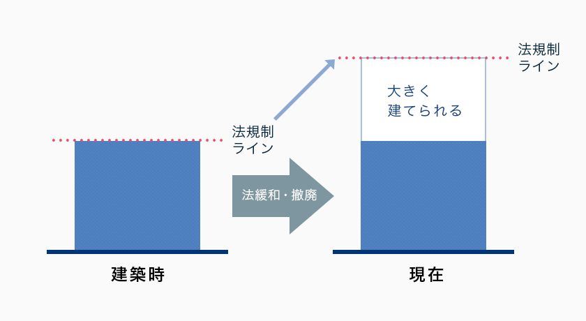 それは、マンション建築時よりも、現在の法規制が厳しくなっているために起こる現象です。